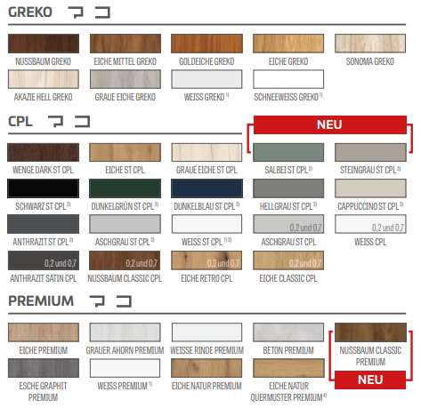 • Die Laminate CPL 0,2 und 0,7 sind nur mit der STANDARD-Kante erhältlich, die mit